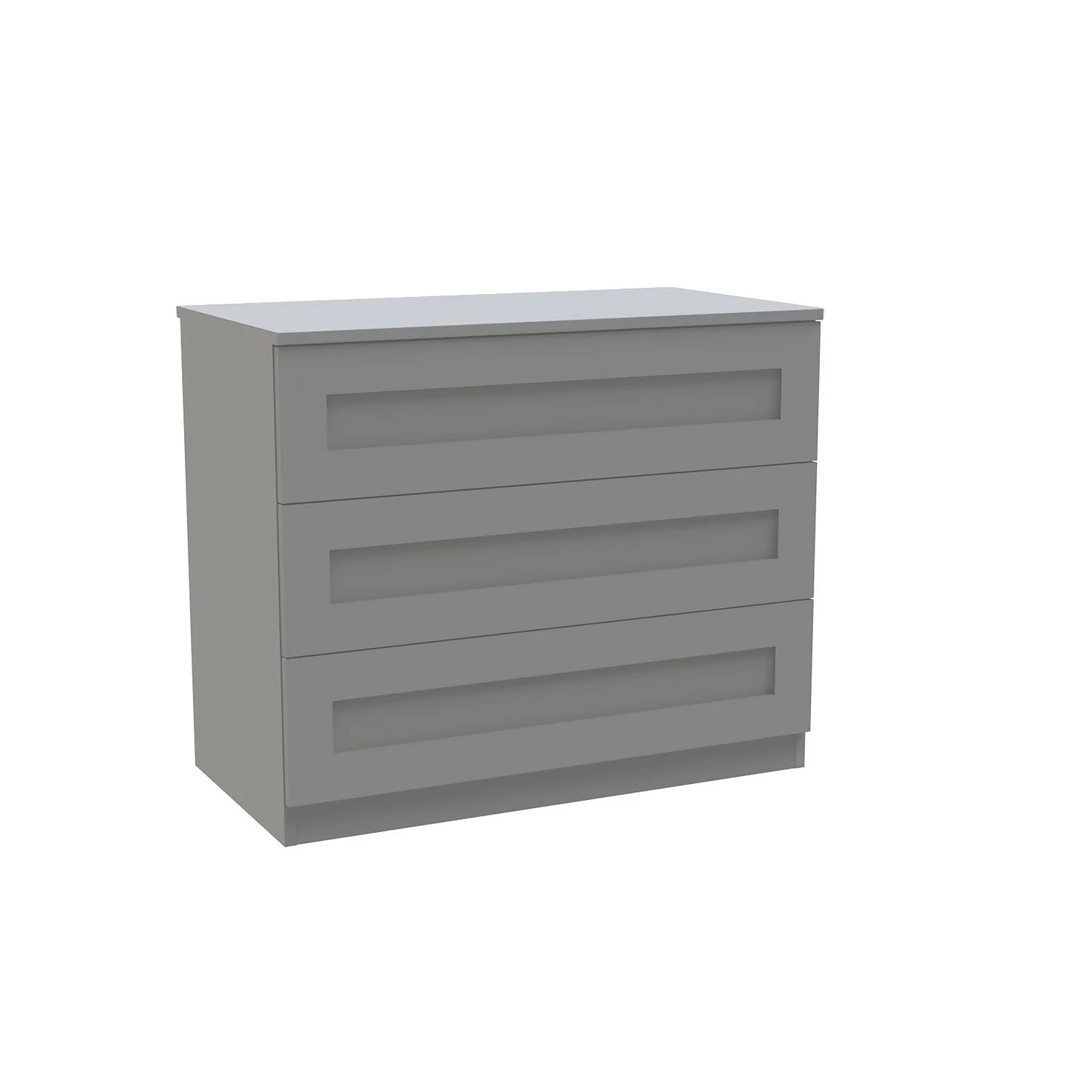 The House Beautiful bedroom range available exclusively at Homebase is full of great ideas and designs for your home. This three drawer chest has been finished in a luxurious matt grey and features colour-matched carcass and drawer fronts, fully wrapped panels, soft-close clip-on Blum runners and an internal drawer box finished in a textured linen effect.